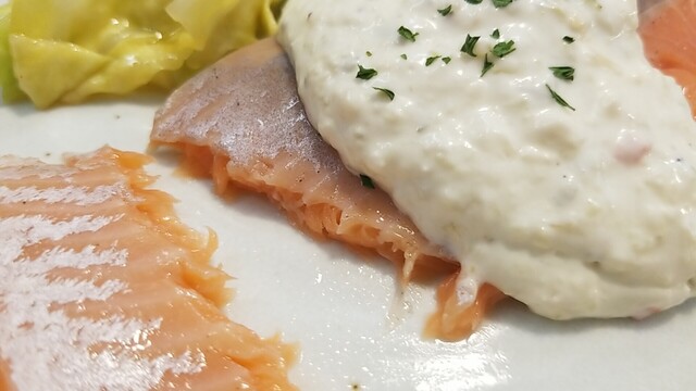 (冷製)銀鮭ミキュイは薄いですが クリームチーズ仕立てタルタルはタップリ!
