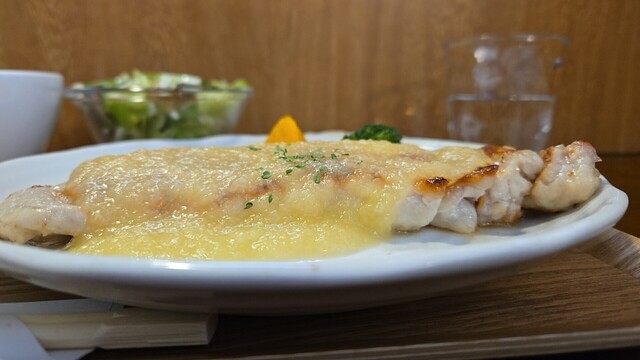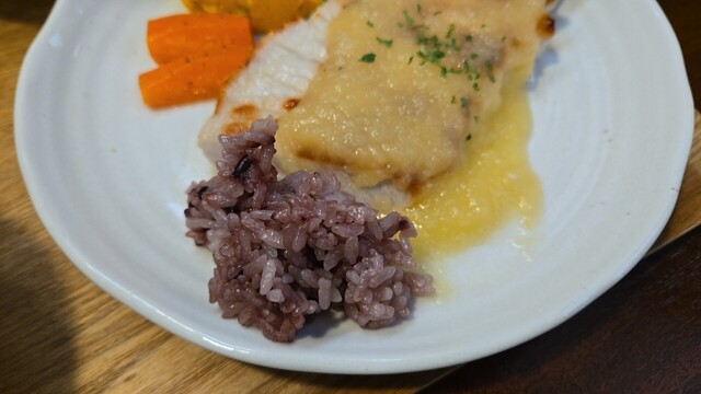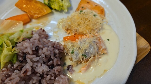 グローブは空いている、ランチは鮭ポワレ ノルマンディー風ソース。