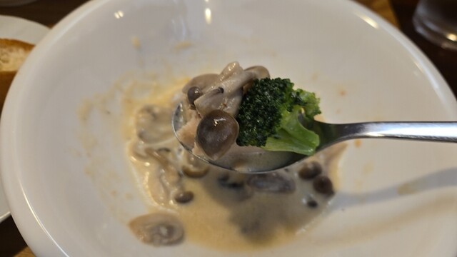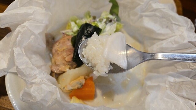 次は茸を添えて、スプーンがあるね、よそっていると、あさりが出てきた。