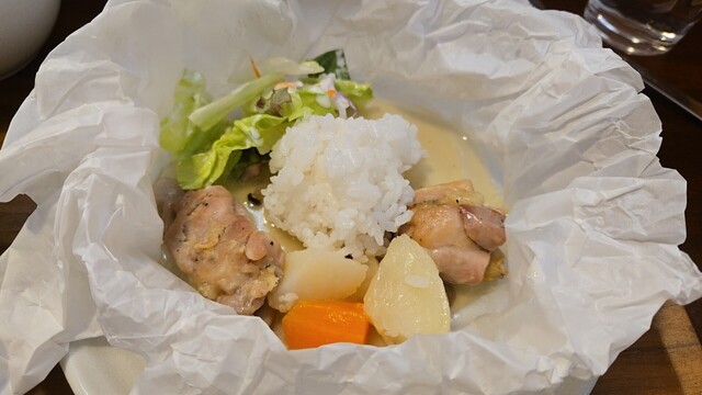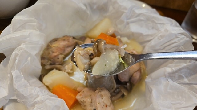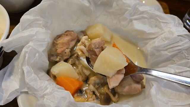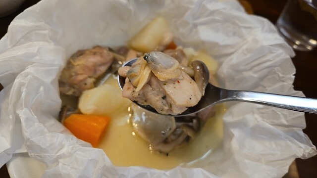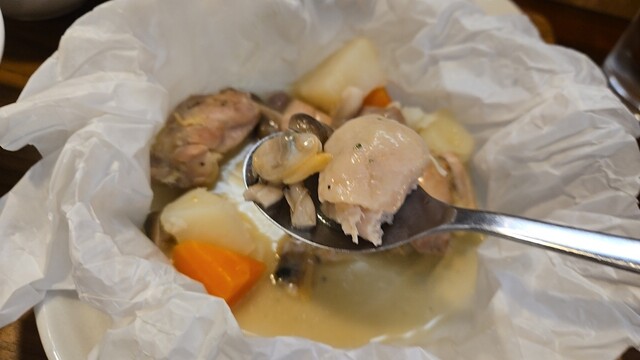 鶏もも肉とアサリのカルトッチョ アレンテージョ風は、野菜とあさりの旨みが凝縮したソース(スープかも)