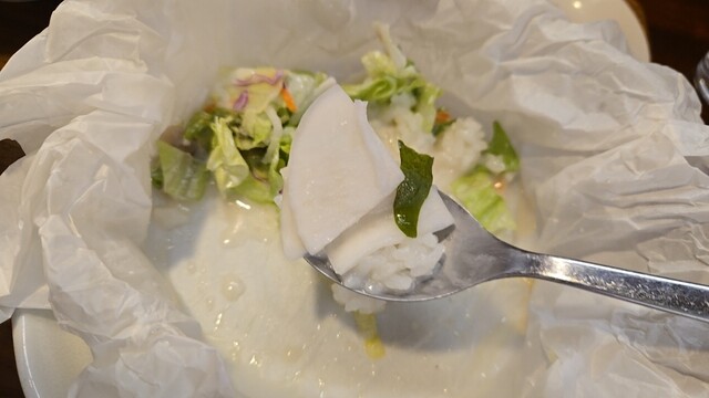 ふた切れ目、あさり・チキンを添えて、次は鶏の皮も添えていただく。