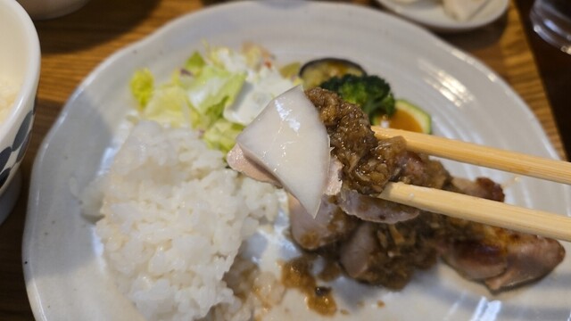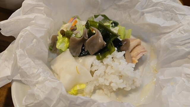 ひと口、柔らかチキン、あさりの出汁が効いているかな、ご飯・お新香が進む。