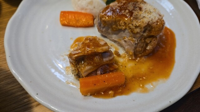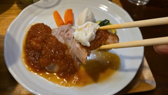 甘い白菜スープを飲み、ひと切れ目、肉をずらすと肉汁が流れ出る。
