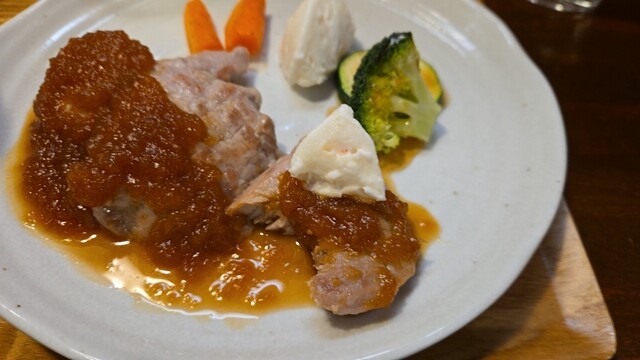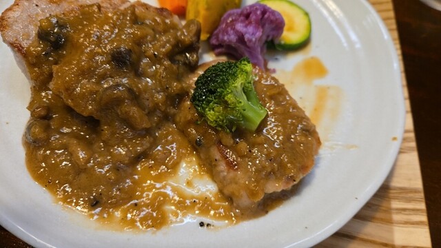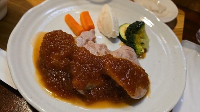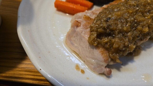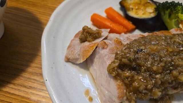 豚ロースソテー ハリッサと生姜の刻み茸ソースである、茸は好み。