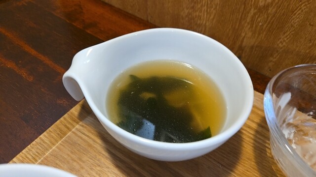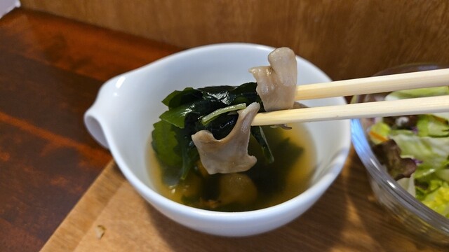 ジャガイモ・人参・茸が見える、磯の香りのわかめスープを飲み。