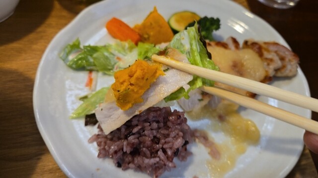 少し大きめの鮭、ふた口目もカダイフを乗せて、モチモチな黒米が進む、お新香も美味い。