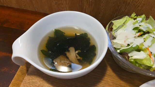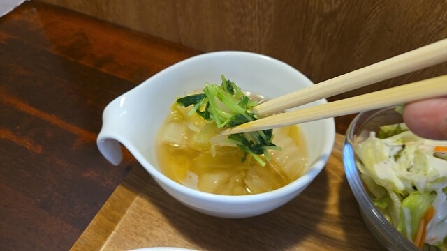 次はサラダと共にタップリソースを添えて、具沢山な白菜スープも美味い。