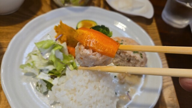 ご飯とサラダを乗せて、ソースをシフトして、次は人参を添えると、甘さが増すね。
