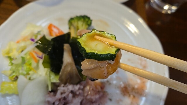 お新香を添えて、次はズッキーニを添えて、忘れていたお新香が余りそう。