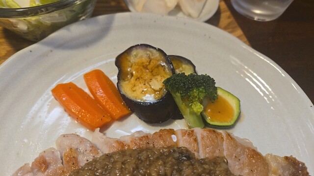 ソテーに人参を添えて、サラダをいただき。次はお新香添えて。