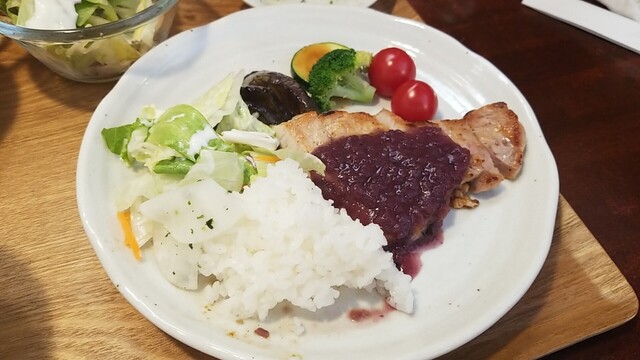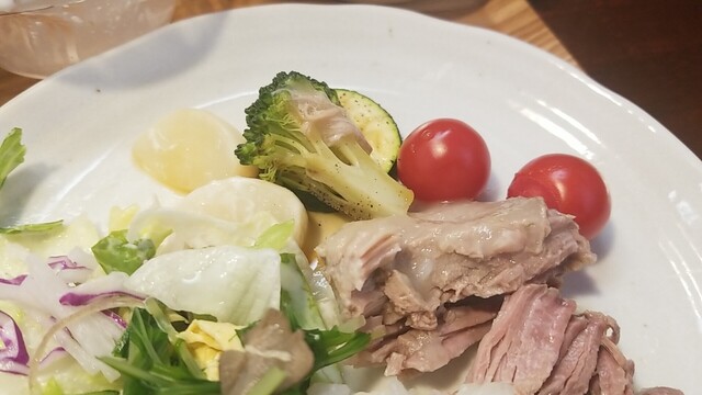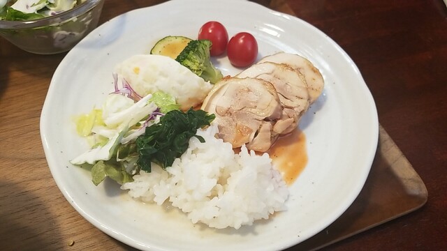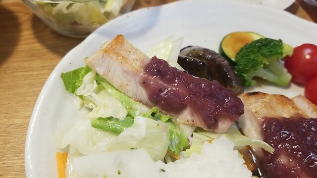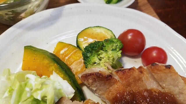 ご飯、サラダ、お新香を乗せて、ソテーは脂身が多くなってきた?
