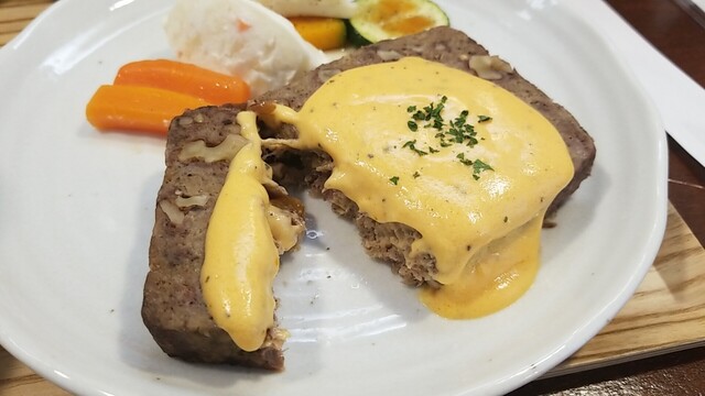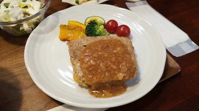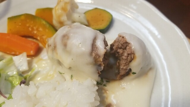 2つ目を食べると、肉汁とソースが流れ出る、崩れるので気持ち食べずらい。