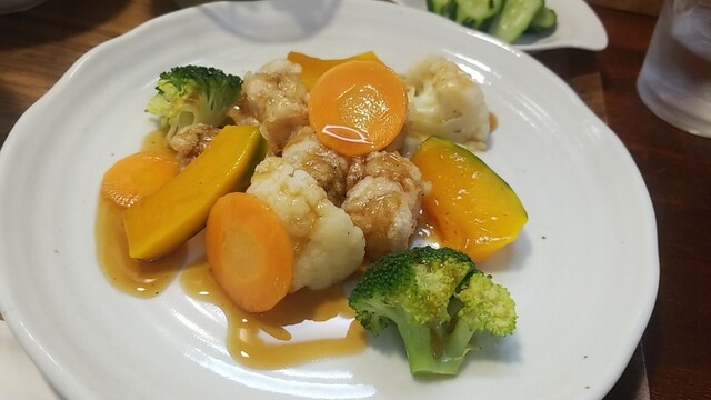 大きめなソテー、ポリネシアンソースは焦がし玉ねぎ色、味も濃厚なソースが好みである。