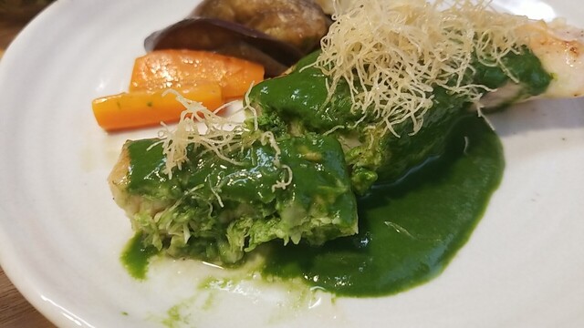 鶏もも肉と海老のガランティーヌ はちみつとプラットオレンジソースである。