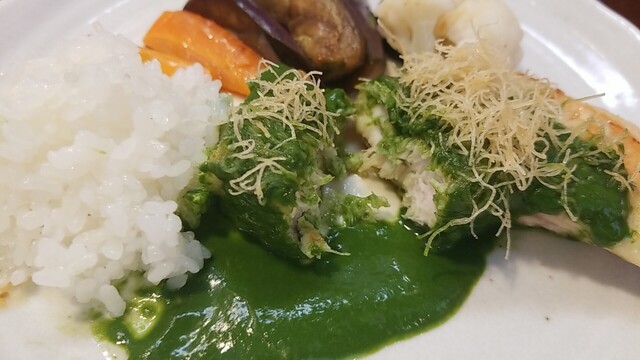 ご飯、サラダ、ほうれん草を乗せて、この甘いソースは、ご飯よりパンが合うかな?