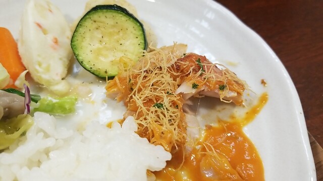 ご飯、サラダ、スープの具材を乗せて、金目鯛には再びカダイフを乗せる。