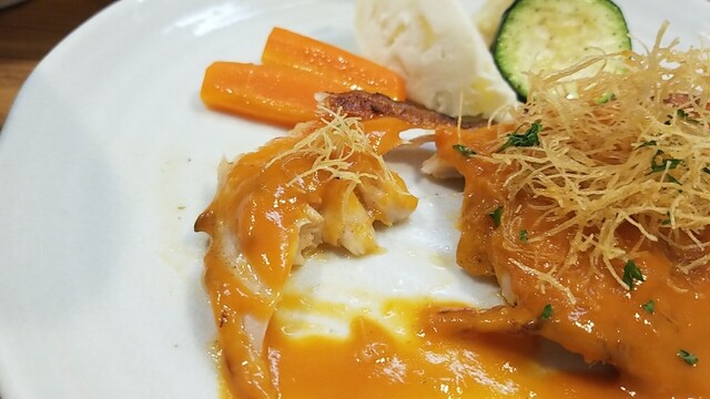 オレンジ色の身は鮭にも見える、身は薄いがソースはしっかりオマール、食べると金目鯛。