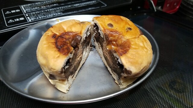 帰宅後、ゴディパンをハーフにカットすると真ん中にあんみそ、回りにチョコ。