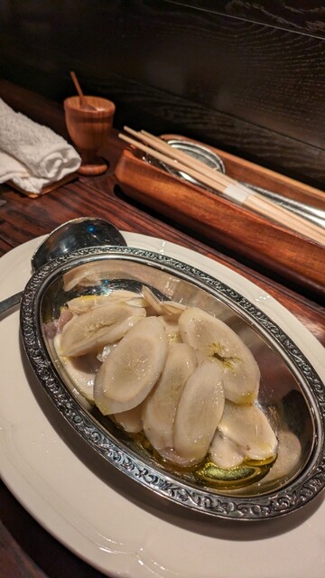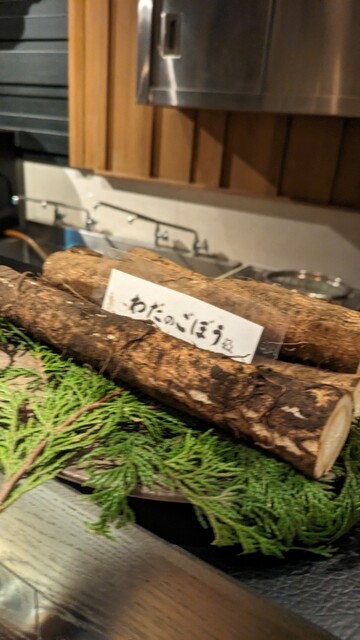 ・神経締めさわらのカルパッチョ わだのごぼうのマリネと一緒に(2900円)