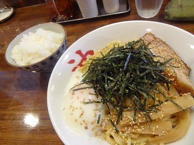 今回は730円の半熟卵入り油そば(大盛り無料)と100円のごはんを注文。