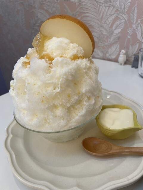 私: はちみつレモンミルクにレアチーズクリームを追加オーダー。季節のフルーツにみずみずしい梨がト...