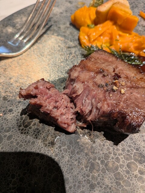 今月はヒラメの魚介タルタルと、メインは十勝牛煮込み。煮込みだけど表面を焦がし焼いてる手法で、本当にいつも丁寧な調理をされてて感心するし、美味しい。