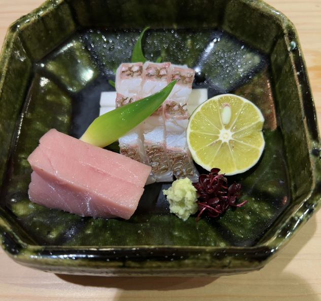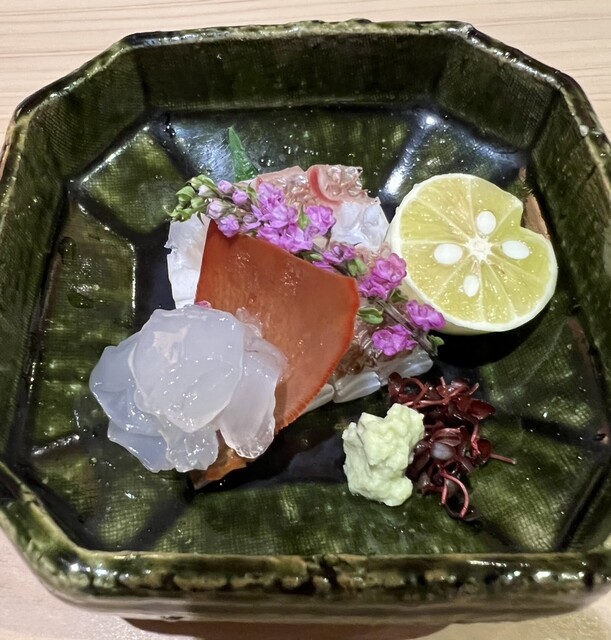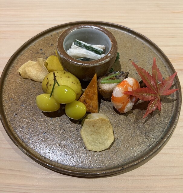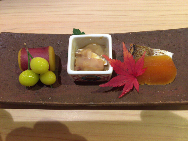 • 昆布締め鯛の海鼠腸和え、唐墨、鮎