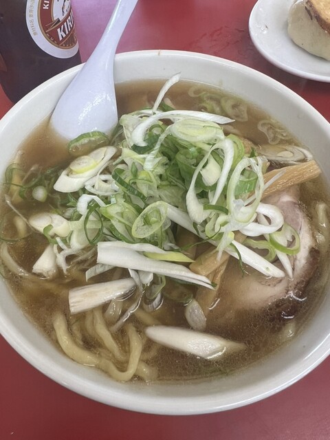 ラーメンは醤油ベースのスープに太めでモチモチの麺、トッピングのたっぷりネギが食欲をそそります。あっさりしながらもコクがあり、最後まで飲み干したくなる一杯でした。