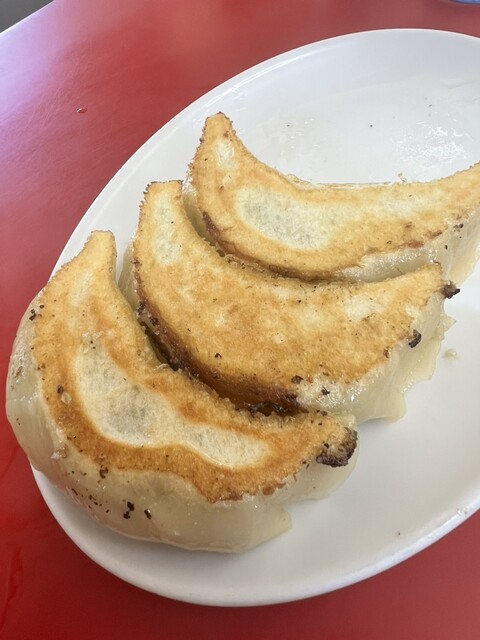 そして名物の大きな餃子。見た目のインパクトはもちろん、皮はパリッと焼き上がり、中はジューシーで食べ応え抜群。ビールとの相性も最高でした。