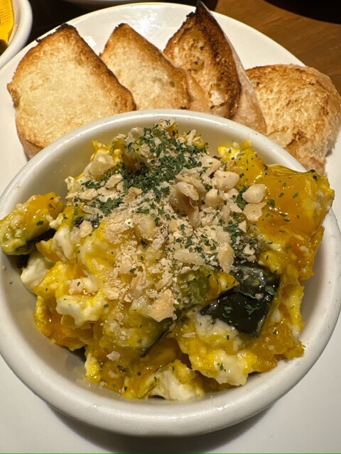 タコのガルシア風も食べ応えがあり、かぼちゃのヘーゼルハニーナッツははちみつの程よい甘さとナッツのザクザク感がバゲットの組み合わせによく合います。