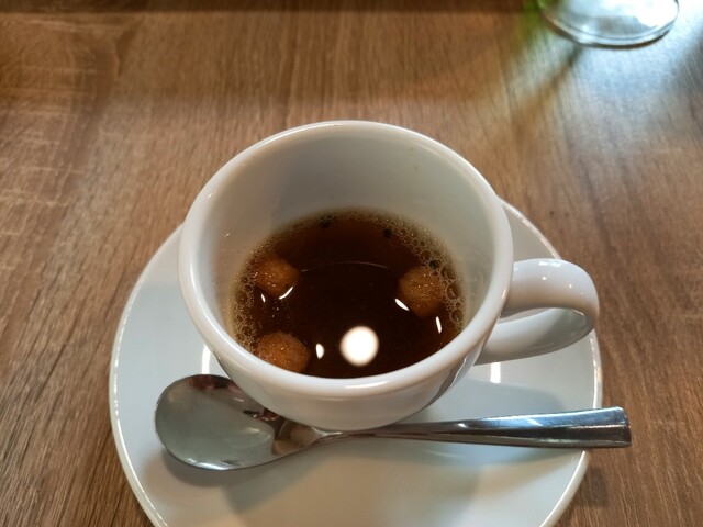今日はフルコースで予約。スープ、前菜3種、メインの魚&肉、デザート&コーヒーの構成です。