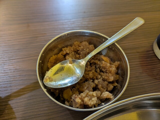 ひよこ豆はほっこりとした食感です。カレー部分もほぼ完全ベジタブルカレーです、タマネギの味と香りがよいですね。カルダモンなどホールスパイスもゴロゴロ入っていてスパイス感は満点。