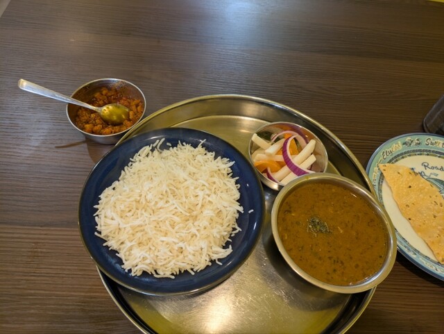 ゴートマサラ(ヤギのカレー)、野菜スティック、ライタ(刻み野菜のヨーグルト和え)、ロティ、にんじんアチャールの構成です。
