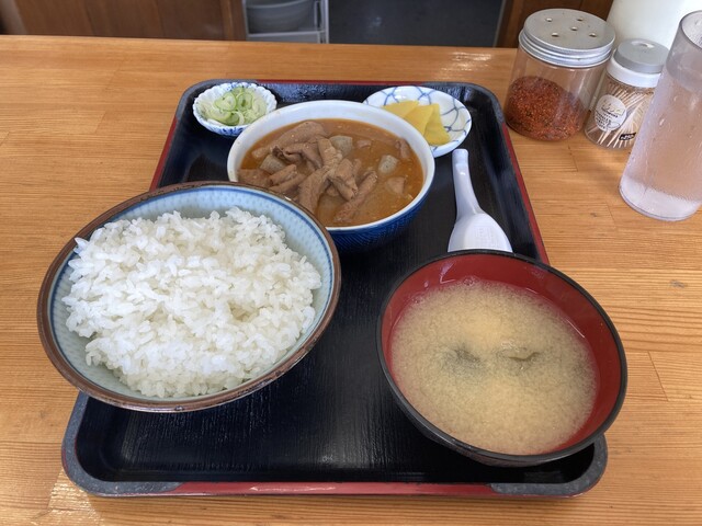 初訪問の今回は無難に、もつ煮定食(590円)を半ライス(-30円)で注文しました。