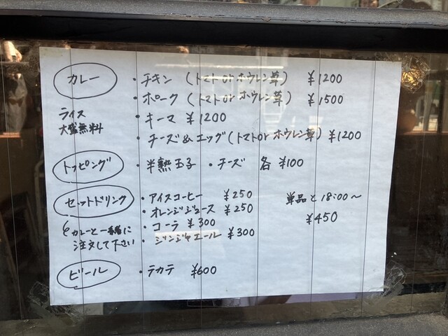 初訪問の今回はチキンカレーのトマト(1,200円)をライス大盛、半熟玉子とチーズをトッピング(各100円)で注文です。
