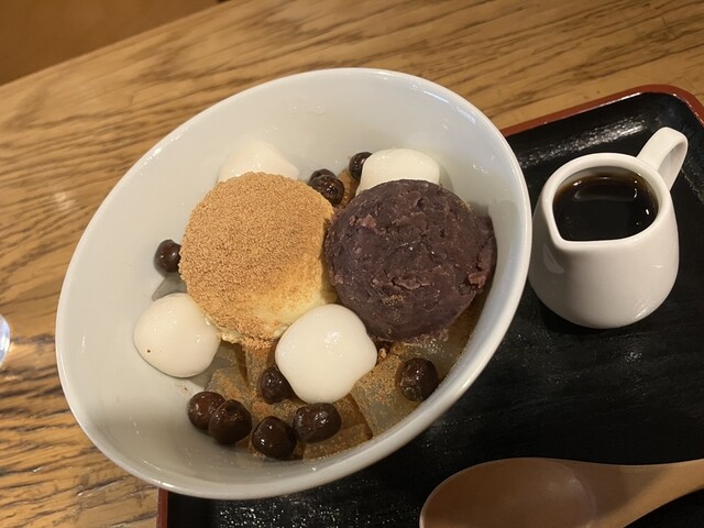 初訪問の今回はTVで紹介されたと言う、きなこクリームあんみつ(858円)を注文。