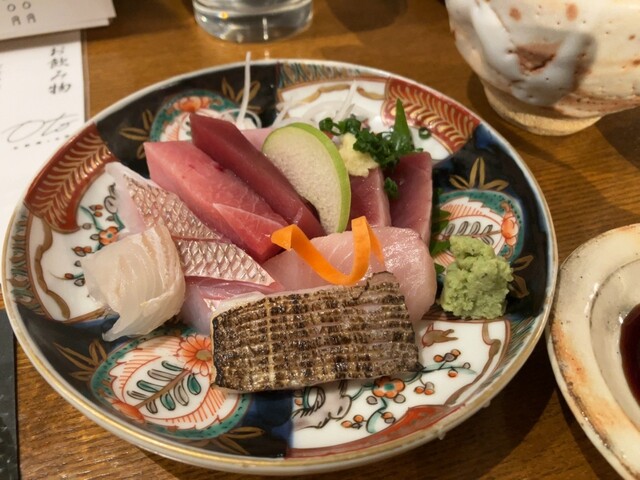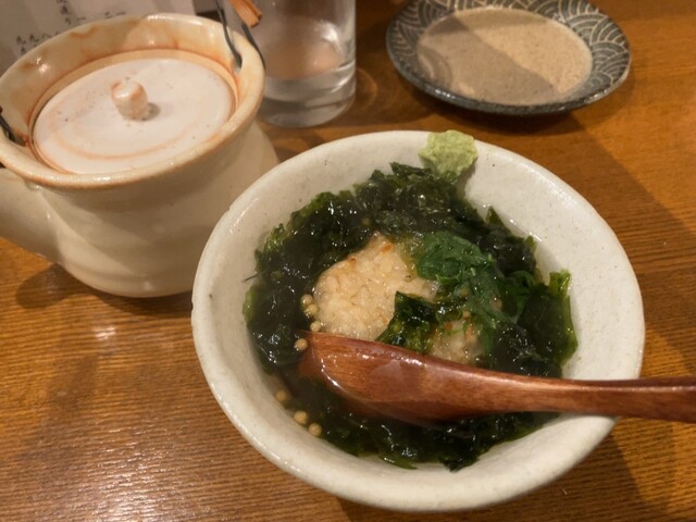 店主おすすめのコースを注文しようか迷いましたが、お料理は、アラカルトで、蓮根ひじき、あん肝ポン酢、お刺身の盛り合わせ1人前、豆あじ南蛮漬け、若鶏の唐揚げ、うずらのたまご青唐ピクルス、蕪の浅漬け、〆はじゃこと大葉の焼きおにぎりのお茶漬けをいただきました。