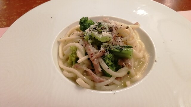 ピーチは温泉卵くずしていただきます。もちもちで美味しいけど少し薄めな味付けかな。