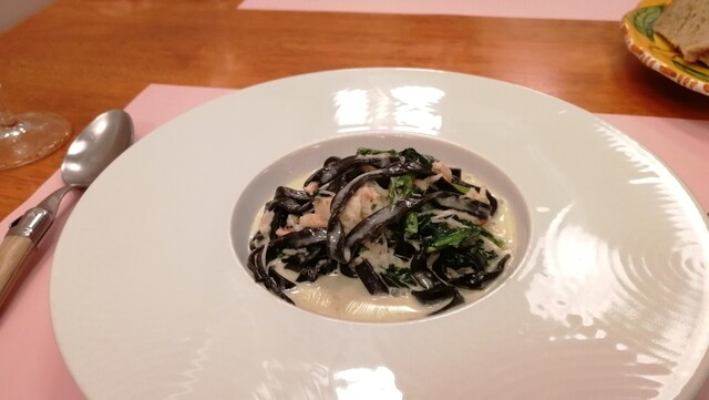 ズワイガニのタリアテッレはあつあつでピリ辛、美味しいですよ。