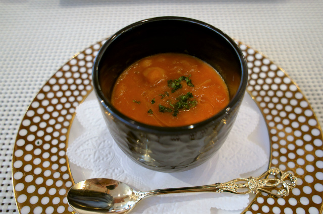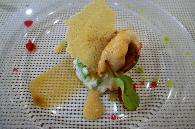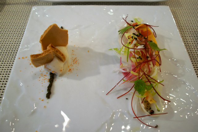 ズワイガニの冷製、ニンジンのムースと生うに 海老とあさりのジュレ。