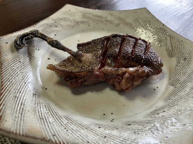 小鴨だけど結構な肉のボリューム 丸っと半身なのかな?ご主人いわく鴨は血が美味しい 焼きすぎると硬くなるとの事で血がしたたるくらいレアな状態 行きつけのお店の鴨料理よりも野生味を感じた