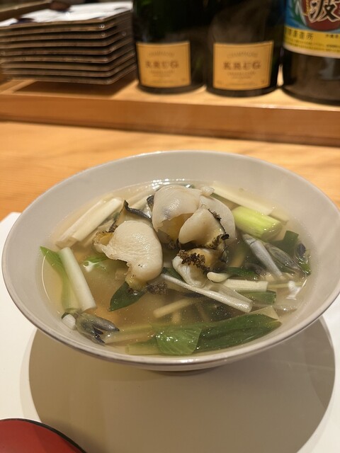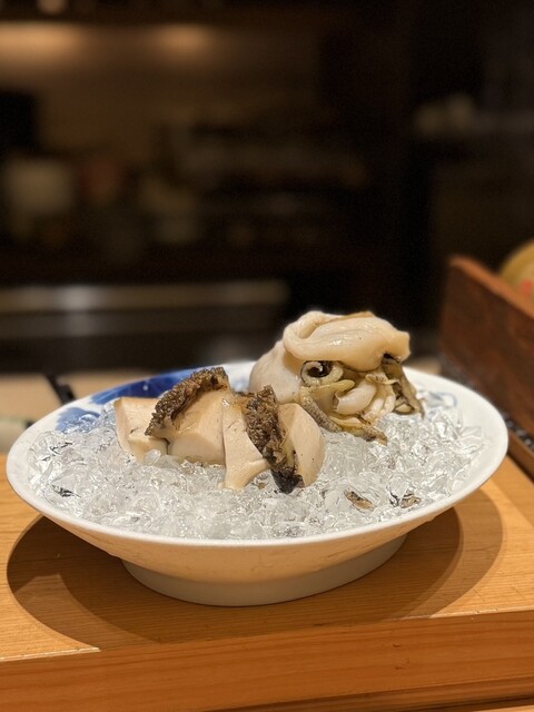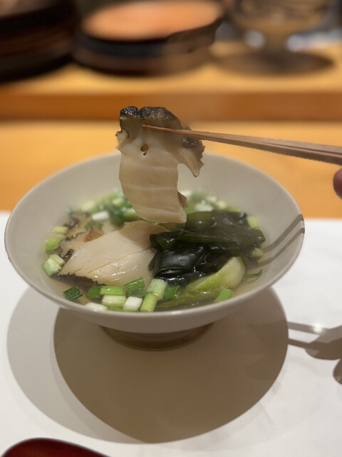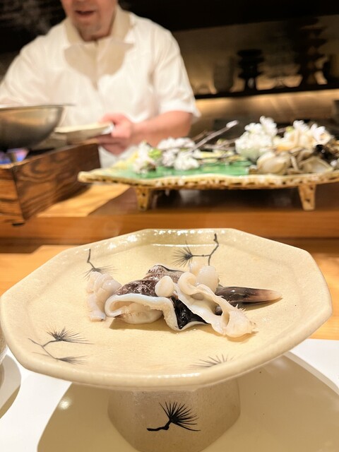 この時期希少な琵琶鱒とフグ白子キャビアからのスタート❣️ お造り〜白甘鯛南蛮漬け〜伊勢海老具足煮(こちらはソースをトーストで頂く)〜圧巻は「巨大な黒鮑の春野菜しゃぶしゃぶ」これには悶絶