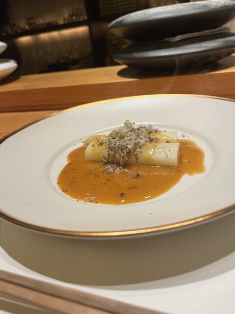余市赤井川農園の5Lホワイトアスバラのじっくり蒸し焼き 卵ソースとサマートリュフ、キャビアかけ