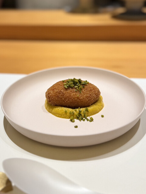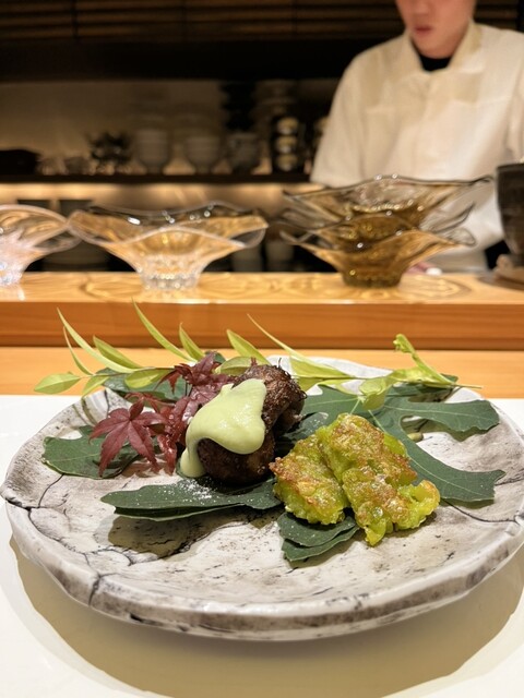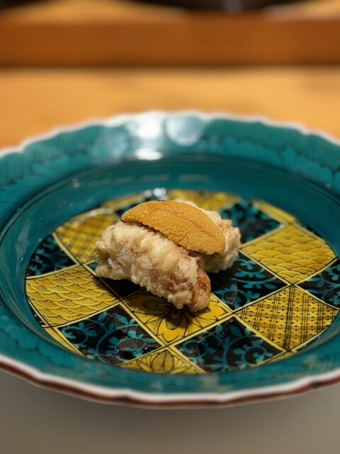 バナナの天ぷら 余市海水ウニのカレー粉葛餡仕立て