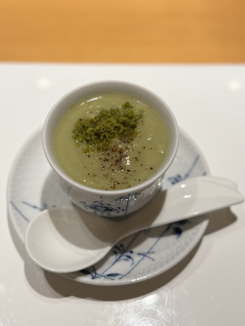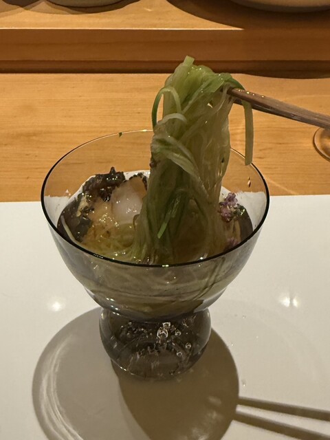 余市赤井川農園のグリーンアスバラ素麺仕立てと黒鮑のしゃぶしゃぶ