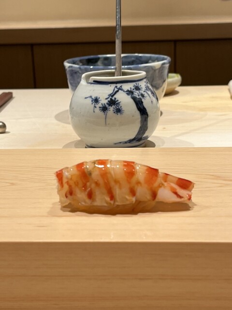 ツマミはハーブ巻きからのスタートで江戸前としてはほんの少し足し算的な加えがあり寿司屋の領域を超えないツマミがとても美味しく握りは女性らしさと言うよりしっかりとした握りで力強ささえ感じる一流の握りです。 この時期の新子は抜群に美味しく頂きました。特出すべきは車海老。こちらの火入れ具合と握りは衝撃的でした。まさに震える旨さ。