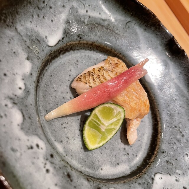 初めてお昼に伺いました。いや〜素晴らしい。まずは青森のじゅんさい。小粒でゼラチン質部分が多く、とても良い食感。ホタルイカは表面が香ばしくワタはクリーミー。定番のタコとアワビはしっかりとした旨味と余韻ある香り。タイは白子と合わせて、クリーミーでかつ食感が最高。赤ウニはジュレ掛け。たまらないトロトロ感とウニの香り。ノドグロは脂が乗っているけどしつこくない。