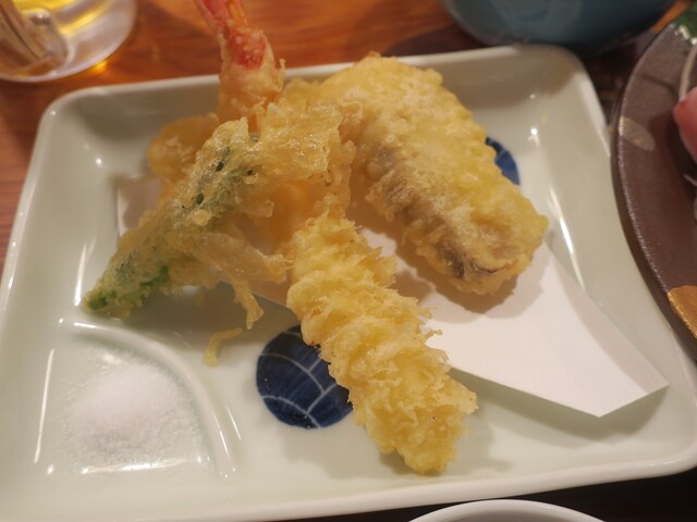 お刺し身に、天ぷら、焼き魚、アンコウの肝合え、アワビのゴボウ煮等