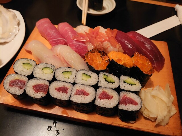 イワシの焼き物、貝尽くしの握りを食べて、友達は鉄火巻き