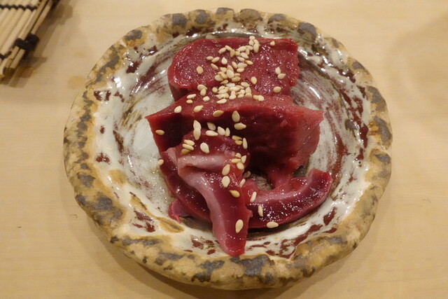 気仙沼発 鮫の心臓、本体と細く見えるのは大動脈とのこと、塩、胡麻 ごま油、コリコリ食感!